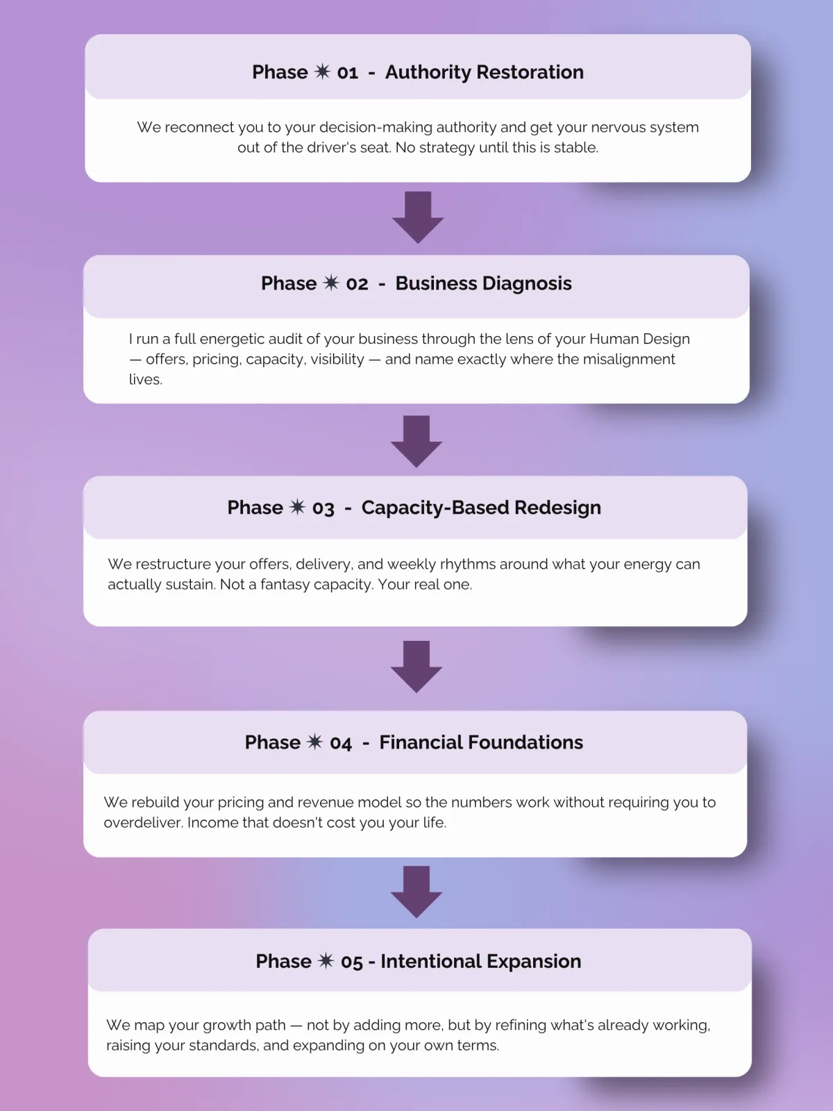 We start with a deep-dive VIP kickoff session where I map your Human Design against your current business and identify exactly where the misalignment lives. From there, we meet biweekly to work through each phase — restoring your authority, diagnosing what's off, restructuring around your capacity, rebuilding your financial foundations, and expanding with intention.